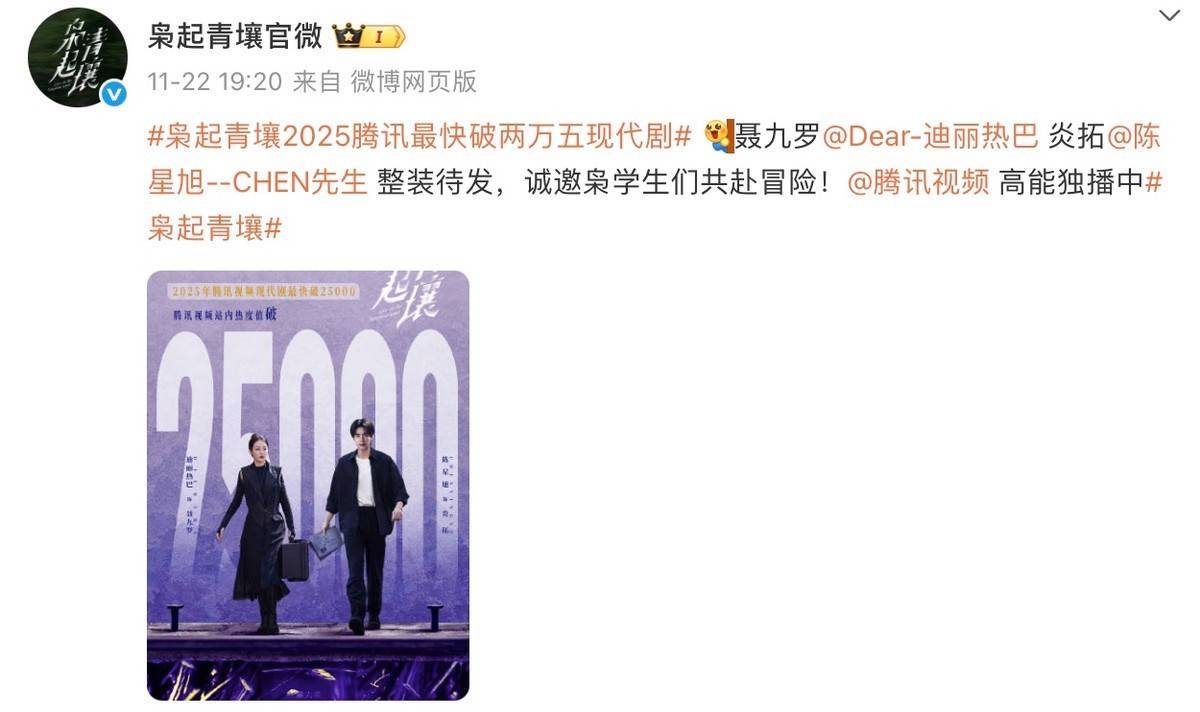 这部由迪丽热巴、陈星旭领衔,根据尾鱼同名小说改编的都市奇幻剧,开播仅一小时站内热度就突破 24000,两小时继续奔着 25000+ 冲刺,成为今年鹅厂破热度纪录最快的剧之一。